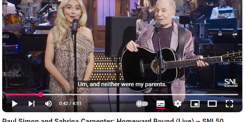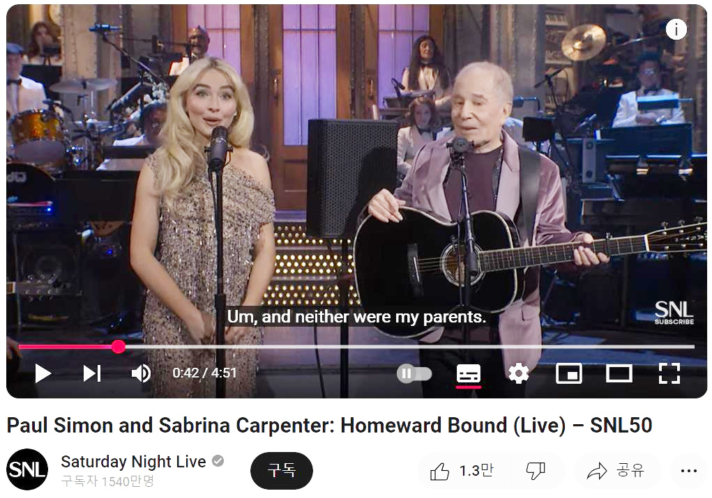 이번 50주년 특집 방송은 '사이먼 앤드 가펑클'로 유명한 원로 싱어송라이터 폴 사이먼(83)과 젊은 팝스타 사브리나 카펜터(25)가 듀엣 공연으로 문을 열었다.