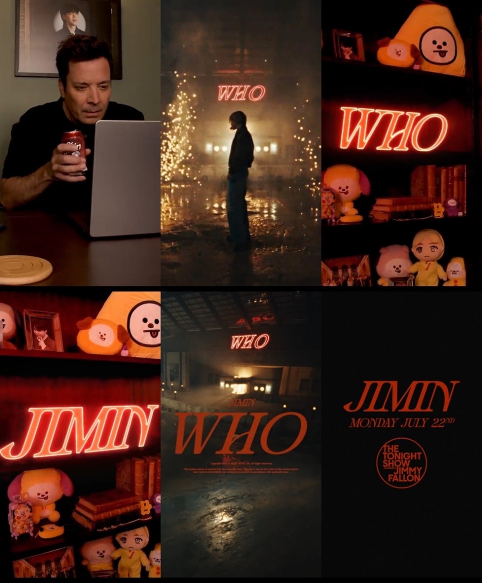 지미 팰런이 '닥터 지민'(Dr. Jimin)이라는 문구가 적힌 캔 음료를 마시며 노트북으로 지민의 무대를 감상하는 장면이 연출됐다. 이어 컷이 전환되면서 무대가 살짝 공개돼 궁금증을 자아냈다.