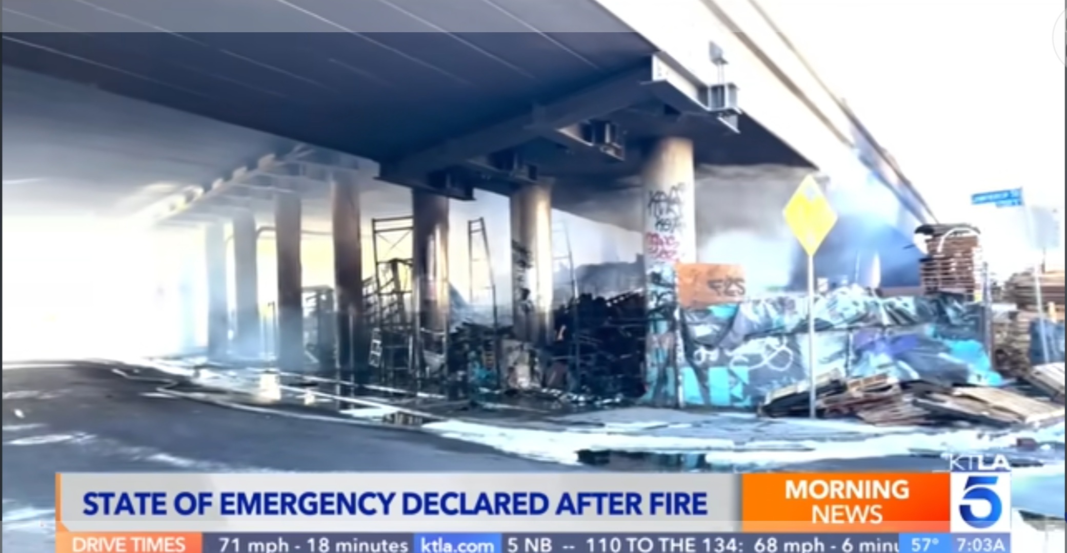방화 추정에 앤젤리노 불만 고조, 도시혈맥인 프리웨이 바로 아래 조성된 팰렛창고와 노숙자 방치등