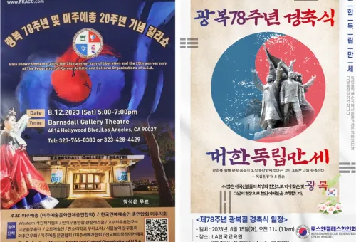다가오는 8월15일 광복 78주년 축하를 위해 LA한인회가 다양한 행사를 소개하고 있다. 우선 8월11일 금요엘 오전10시에 LA시의회에서 진행되는 선포식이다. 시간 은 오전 10시, 장소는 LA시의회(JOHN FERRARO COUNCIL CHAMBER) 다. 또한 광복 78주년 기념 & 미주예총 20주년 기념 갈라쇼는 8월12일 토요일 오후 5시, Barnsdall Theater(4814 Hollywood Blvd., LA, CA 9027)에서 개최된다. 참석비는 없다. 8월14일 월요일 오후 7시에는 광복절 축하 전야제 타종식이 우정의종각(3601 S Gaffey St, San Pedro, CA 90731) 에서 진행되며 참석 및 관련문의는 우정의종보존재단 213-284-1212 로 하면된다. 광복 78주년 기념 메인 경축식  & 일제전쟁범죄 사진전은 8월15일 화요일 오전 11시 한국교육원 (680 Wilshire Pl #200,  )에서 진행된다. 특히, 8월15일(화) 오전11시에 있을 메인 경축식에서는 비교적 널리 알려지지 않은 독립운동가 약 30여명을 소개하고 그분들의 후손들에게 태극기를 전하는 뜻깊은 순서를 준비하고 있다고 밝혔다. 아직, 연락이 닿지 않은 독립운동가 후손들을 계속 찾고 있으며 비록 한국처럼 공휴일은 아니지만, 독립운동가들의 헌신과 희생을 기억하고 감사하는 마음을 모두가 함께 갖기를 바라며, 보다 많은 한인들의 참여를 기다린다. 참석 문의 참석 및 관련문의 : LA한인회 사무국 323-732-0700 / 213-999-4932