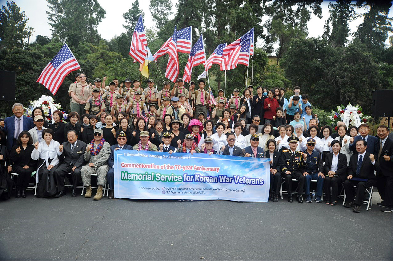 메모리얼 데이 연휴를 맞이 지난 5 27 토요일 오전11, 플러톤의 한국전 참전비가 세워진 “Korean War Memorial Park”에서  오렌지카운티 북부한인회(회장 김태진) 미주 3.1여성동지회(회장 캐롤리) 공동으로 주관한 ‘한미동맹 70주년 기념 한국전쟁 참전용사 추모식’이 성대히 열렸다.