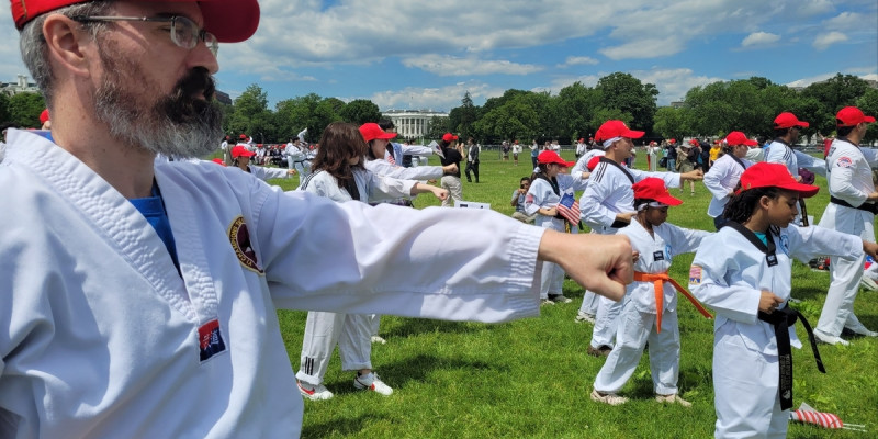 국기원이 18일(현지시간) 한미동맹 72주년을 기념하기 위해 워싱턴DC 백악관 인근 공원에서 개최한 한마음 태권도 축제에서 참가자들이 '태극 1장'을 함께하고 있다.