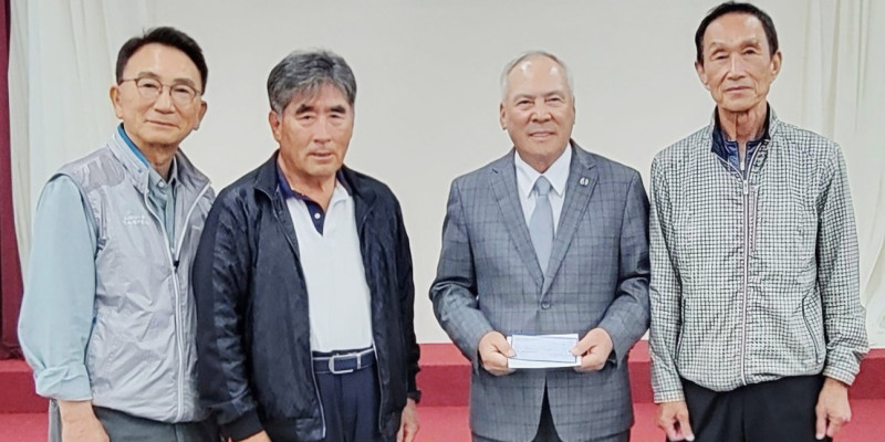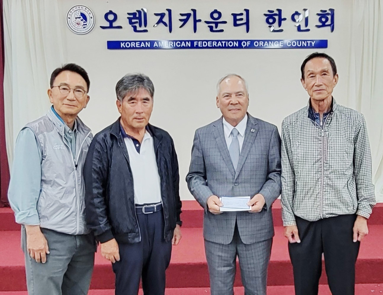 재정난으로 비롯한 건물매각 논란에 휩싸였던 OC한인회관을 둘러싼 갈등이 드디어 봉합세로 돌아섰다. OC지역 독지가가 드디어 직접 나서 마무리한 결과로 전대 회장단들은 물론 지역 대부분인사들이 적극 지지하는 모양새다. 사진은 40여만불의 부채가 모두 정리될때까지 지원하기로 한 지원금을 전달 받고 기념 촬영을 하고 있다. 왼쪽부터 최광진 OC상우회장, 권석대 전한인회장 겸 현 한인회관 관리위원, OC한인회 현 조봉남회장, 김복원 전OC한인상공회의소 회장 (OC한인회 제공)