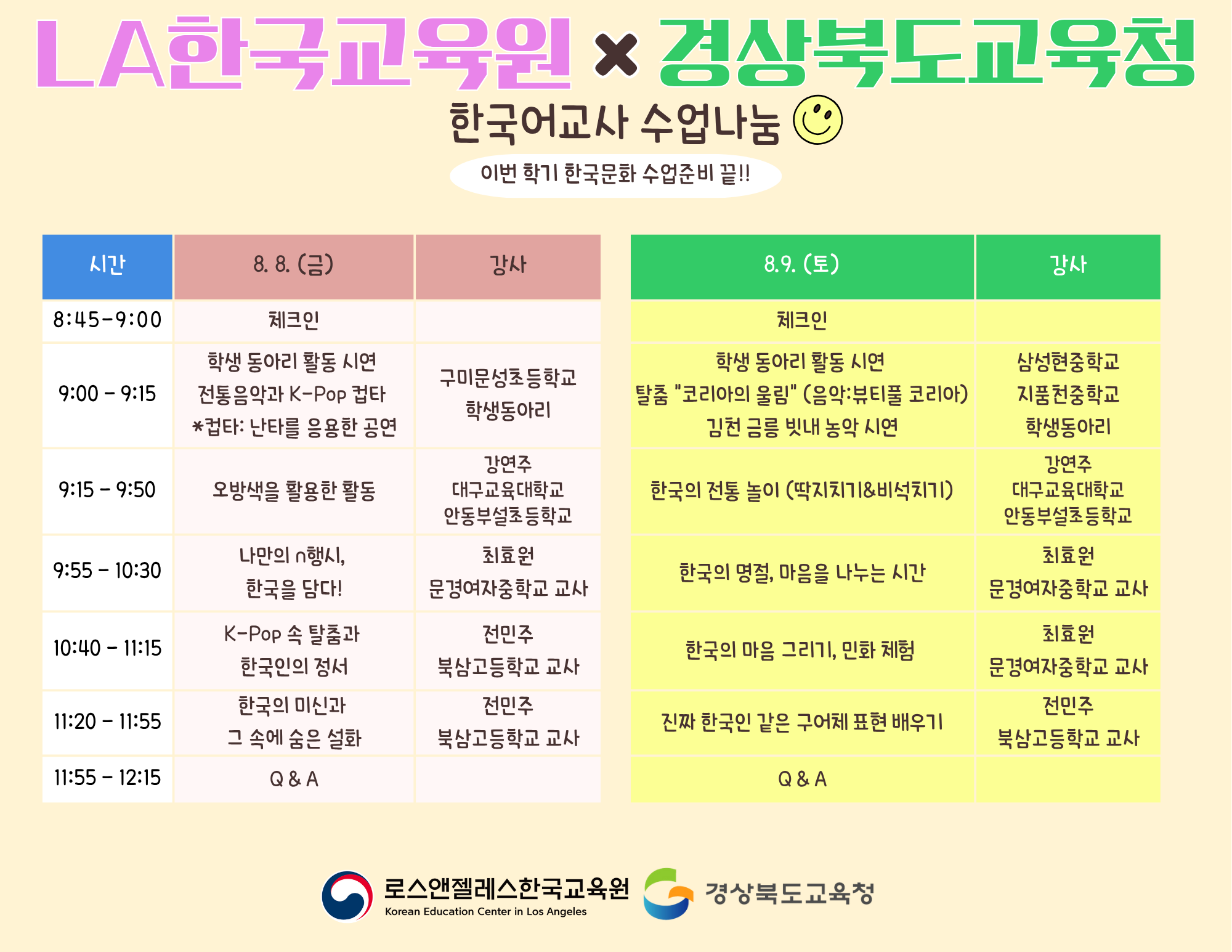 LA한국교육원(원장 강전훈)과 경상북도교육청(교육감 임종식)은 오는 8 월 8일(금)과 9일(토)에 정규 초중고교 한국어반 교사와 한글학교 교사 들을 대상으로 ‘실전에 바로 적용 가능한 한국문화 수업나눔 연수’ 를 LA한국교육원에서 개최한다.