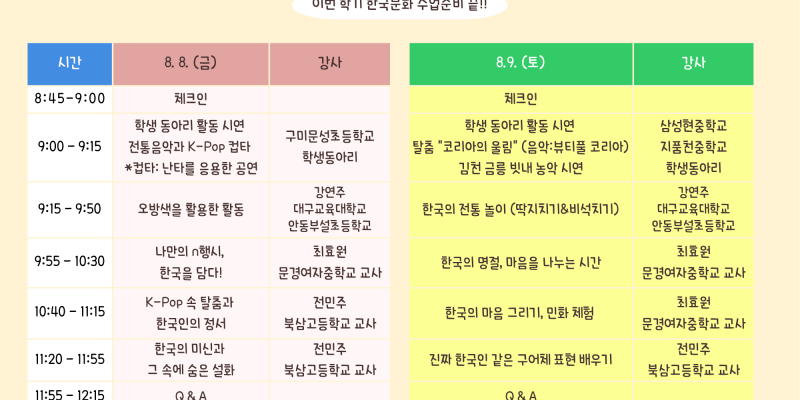 강연주 교사 (대구교육대학교안동부설초등학교)는 ‘오방색’을 활용한 체험 활동과 한국 전통놀이를, 최효원 교사 (문경여자중학교)는 ‘나만의 n행시’, 한국 명절 문화, 민화 체험을, 그리고 전민주 교사는(북삼고등학교)K-Pop 속 탈춤과 한국인의 정서, 한국 전설, 진짜 한국인 같은 구어체 표현 배우기를 담당한다.