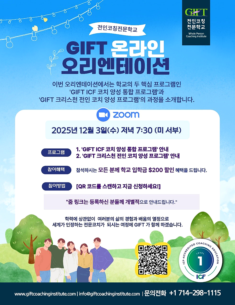국제코칭연맹(ICF) 공인 전문교육기관인 GIFT 전인코칭전문학교(GIFT Whole-Person Coaching Institute, 원장 리디아 전 박사)가 오는 12월 3일(수) 저녁 7시 30분(미서부 시간), 온라인 Zoom 오리엔테이션을 개최한다.