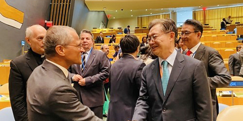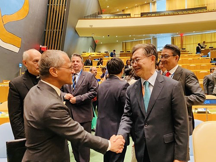한국 목표 180표 달성…정부·유엔대표부·재외공관 삼각공조 효과 이시카네 기미히로 주유엔 일본대사의 축하를 받는 황준국 유엔대사