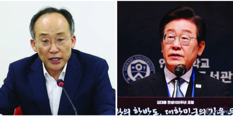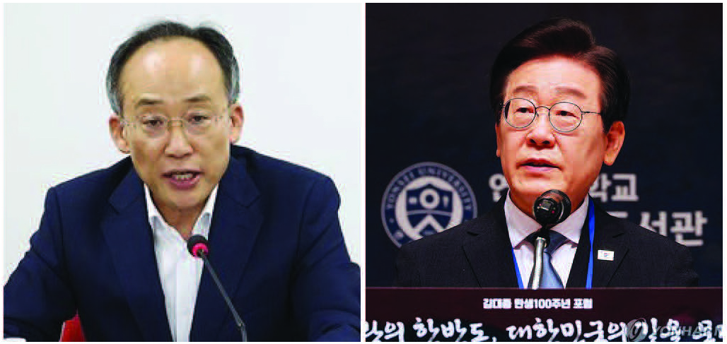 국민의힘 추경호 원내대표가 22일 여의도 당사에서 열린 최고위원회의에서 발언을 하고 있다(왼쪽사진),더불어민주당 이재명 대표가 21일 오전 서울 중구 프레스센터에서 열린 김대중 탄생 100주년 포럼 \'격랑의 한반도, 대한민국의 길을 묻다\'에서 축사하고 있다.