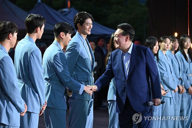 윤 대통령은 행사장에 들어서며 근대5종 성승민 선수, 양궁 이우석 선수에게 "우리 선수들이 경기하는 것을 재밌게 봤다"고 반갑게 인사했다.