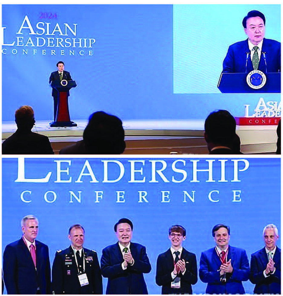 윤석열 대통령이 22일 서울 중구 신라호텔에서 열린 \'2024 아시안리더십콘퍼런스 개회식\'에 참석해 축사를 하고 있다(위사진), 윤석열 대통령이 22일 서울 중구 신라호텔에서 열린 ‘2024 아시안리더십콘퍼런스 개회식’에서 상봉한 주한미군 유리 크니시브, 알렉산더 크니시브 부자와 기념촬영을 하고 있다. 왼쪽부터 마이클 폼페이오 전 미국 국무부 장관, 케빈 매카시 전 미국 하원의장, 유리 크니시브, 윤 대통령, 알렉산더 크니시브, 론 클레인 미국 바이든 대통령 초대 비서실장, 람 이매뉴얼 주일미국대사.