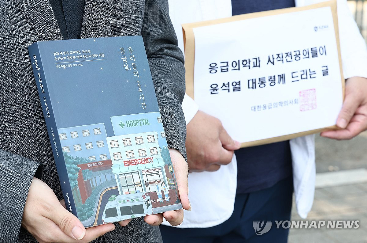 응급의학 전공의들, 대통령에게 전달할 책은? 22일 오후 서울 용산 대통령실 앞에서 대한응급의학의사회 이형민 회장과 응급의학과 사직전공의들이 윤석열 대통령에게 전달할 편지와 책을 들고 기자회견을 하고 있다.
