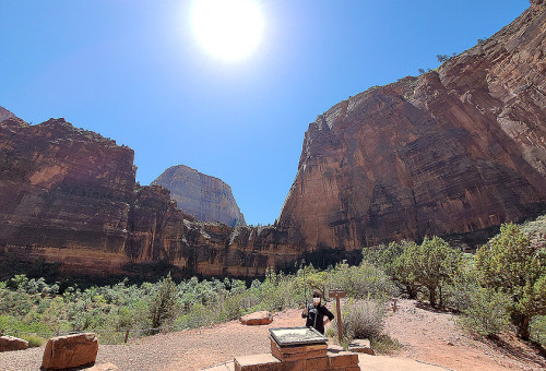리버사이드 트레일을 통해 내로우 크릭 하이킹까지 마치고 우리는 젖은 신발, 젖은 옷차림새로 돌아섰다. 이나이 먹도록 사라지지 않는 호기심과 궁금증을 체력의 한계를 이유로 접어내는 일은 죽기보다 싫은 일이지만 동행자에게 이보다 더 폐를 끼칠수는 없는 관계로 아쉽게 돌아선거다.  아직 당뇨병에 시달리지는 않지만 의사 말이 조심하라 했으니 조심 할 밖에. 템플 오브 시나와바에서 백팩에 담아온 아직 차가운 오이와 귤, 땅콩버터와 잼을 바른 샌드위치로 간단하게 요기를 한 후 다시 트램을 타고 한 정거장 내려왔다. 빅 벤드다. 빅 벤드 스탑은 위핑 롹 이라는 곳으로 가기 쉬운 정거장인데 위핑 롹은 일시 폐쇄 중이다. 일단 내려서 반대편 풍광을 살폈다. 자이온 파크는 어디에 서서 어느 쪽을 바라보든지 백점 만점에 백이십점을 줄수 밖에 없다.  빅 밴드에서도 마찬가지 였다. 멀고 가깝게 산들이 줄지었고 높다란 붉은 산 들 사이에 보이는 푸른 하늘은 언제 보아도 만족스럽다.  위핑롹은 자이온에 있는 많은 트레일 중에 제일 짧고 수월한 거리여서 많은 방문객이 오고 가는 곳이다. 커다란 바위에 움푹 파인 형세인데 바위 높은 곳에서 부터 줄줄 흘러내리는 물줄기가 마치 사람이 울고 있는 것 같은 형국이라 아마도 붙여진 이름이 아닌가 한다. 위핑 롹(Weeping Rock), 우는 바위다. 한 여름 더울때 움푹 파인 바위, 그 아래 서면 흩뿌려지는 차가운 물줄기를 통해 뼛속까지 시원해 진다. 땀인지 물인지 눈물인지 알 수 없는 축축함이 얼굴에 닿으면 묘한 상쾌함을 경험하곤 했는데 이번엔 공사 관계로 폐쇄됬단다. 그 또한 아쉬움이다.  위핑롹을 왼쪽에 두고 오른쪽으로 하이킹을 계속하면 그 뒤로 경사진 트레일이 이어진다. 지금까지 수도 없이 자이온에 올라왔지만 이 트레일은 보기만 해도 겁이 덜컥 나는 경사길들이라 나의 심장과 폐활량, 찾아볼수 없는 근육량으로는 꿈에도 도전의 생각이 들지 않는다.  안내 표지판을 살펴보니 내가 등지고 서 있는 반대편 넙대대한 바위 꼭대기가 바로 엔젤스 랜딩이란다. 앤젤스 랜딩에 관한 추억은 뿌듯함과 만족, 죽고 싶을만큼 힘들었던 괴로움, 녹아버릴듯한 뜨거움 등이 교차하는 내 인생에서 몇 안되는 묘한 기억이며 동시에 죽기전에 반드시 다시 올라가보고 싶은 트레일 이다. 지난번 방문때 경험한 앤젤스 랜딩 하이킹 후기는 이제부터 써볼 작정이다.