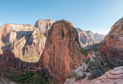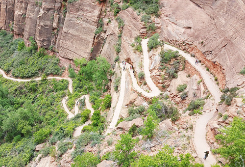 앤젤스 랜딩에 오르다! (두번째 이야기) 동으로 가나 하면 곧 서로 향하고 서쪽인가 하면 북쪽을 향하면서 꼬불꼬불 돌아가는 길이 무려 아흔 아홉번이 있다고 한다. 내가 직접 확인 한 것이 아니니 알수는 없지만 하늘에서 찍은 사진을 보면 그야말로 장관이다. 수십번 반복되는 핀헤드 스타일의 턴을 따라 걷다보면 고소공포증이 없는 사람들조차 멀미가 날 듯하고 어지간한 계단식 오름길도 존재를 잊은 다리근육들이 비명을 지르듯 후둘거리기 시작한다.  길고 긴 오르막 여정의 오로지 보람은 돌고돌며 방향이 바뀔 때마다 펼쳐지는 자이언의 풍광으로 그야말로 Breath Taking (숨 막힐 듯 하다는)이라는 단어 외엔 달리 표현할 방법이 없다.   엔젤스 랜딩은 자이언캐년 지역에서 가장 유명하고 감동적인 View Point로 1800미터정도의 높이에서 보는 전경은 정말 기절할만큼 황홀한 전경을 보여준다. 캐년의 전반적 경치는 Big Bend나 Weeping Rock근처에서 경험할 수 있지만 앤젤스랜딩의 정상은 동서남북 사방으로 펼쳐진 전경이 가능해서 자이언캐년의 좁은 능선과 깊은 협곡을 한 눈에 볼수 있고 멀리 Kolob고원지대의 단면까지도 한 숨에 볼수 있다. 1926년에 완성됐다는 이 길고 오묘한 코스는 고소공포증이 있거나 유약자, 임산부, 노년층들에겐 적합하지 않을 수 있다. 5.4마일의 험한 길을 평소 체력과 그날의 날씨 상황에 따라 3시간-5시간 걸어야 하는 관계로 여름이면 새벽 첫 셔틀을 타고 일찍 출발해서 날이 뜨거워지기전에 올랐다가 내려오는 것이 상책이다. 반면 비성수인 늦가울부터 초봄까지는 산정상의 급강하 할 수 있는 날씨와 눈, 비바람 대처를 위한 준비도 필수다.   산 정상 날씨는 변덕이 심한 관계로 산 아래에서 맑았던 하늘이 위에서는 갑작스런 소낙비와 강풍, 천둥 번개가 올 수도 있으므로 조심해야 한다. 실제로 매년 이 트레일에서 목숨을 잃는 방문객들도 다수 보고되고 있어서 2000년도 이후 지금까지 무려 17명이 실족 등으로 사망했다.   팬더믹 기간 동안 움츠렸던 사람들이 국립공원 개방과 함께 엄청나게 늘어났고 자이언파크 역시 연일 방문자 최고 기록을 경신하고 있다. 앤젤스랜딩 하이킹은 파크 안에서도 가장 인기있는 코스라 2019년 통계에 의하면 자이언파크 연중 방문자 수가 4백오십만명에 앤젤스랜딩 하이킹을 하는 사람들은 하루 평균 천여명이 넘으며 성수기인 7월, 8월중엔 그 보다 훨씬 늘어나게 된다.  최근에도 건장한 청년들의 실족사가 계속 보고 되면서 앤젤스랜딩 하이킹 코스의 안전문제는 계속 논란 중이며 유튜브에는 앤젤스랜딩 하이킹이 위험한 이유등을 설명하는 영상들도 간혹 눈에 뜨인다. 결국 하이커들의 숫자를 줄이는 방법으로 매일 새벽에 추첨을 통해 방문자를 조절하려는 움직임도 있다는 소식이 전해졌다. 방문객들의 안전을 위한 조치이지만 애초 하이커들 각자가 스스로 안전을 위해 최대한 조심하는 것이 필요하다.  이제 본격적으로 엔젤스랜딩을 올라가보자. 이곳을 가려면 셔틀버스가 서는 그로토(The Grotto)에서 약 5시간(4km) 이상을 하이킹해야 하는 그다지 길지도 짧지도 않은편이지만 정상 직전까지는 포장이 돼 있어, 남녀노소 누구나 유쾌하게 등정할 수 있다. 평상시 운동량이 많지 않은 사람들에겐 느리고 긴 약간의 업힐길이 얼마나 고된것인지는 당사자 외엔 알수가 없는 일이긴 하지만 말이다.   그러나 정상을 700~800미터쯤 남겨둔 지점부터는 장난이 아닐 정도로 경사가 급해진다. 급한 경사 못지 않게 힘든 것은, 한쪽으로 난 아찔한 낭떠러지입니다. 웬만한 사람이라면 울렁증이 일어나지않을 수 없다. 중간 중간 손잡이용 난간이 있지만, 고소공포증이있는 사람에겐 대략 난감이다.