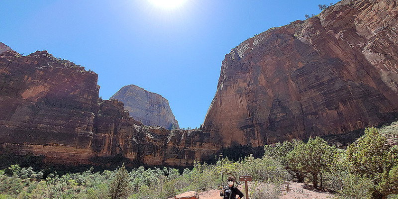안내 표지판을 살펴보니 내가 등지고 서 있는 반대편 넙대대한 바위 꼭대기가 바로 엔젤스 랜딩이란다. 앤젤스 랜딩에 관한 추억은 뿌듯함과 만족, 죽고 싶을만큼 힘들었던 괴로움, 녹아버릴듯한 뜨거움 등이 교차하는 내 인생에서 몇 안되는 묘한 기억이며 동시에 죽기전에 반드시 다시 올라가보고 싶은 트레일 이다. 지난번 방문때 경험한 앤젤스 랜딩 하이킹 후기는 이제부터 써볼 작정이다.