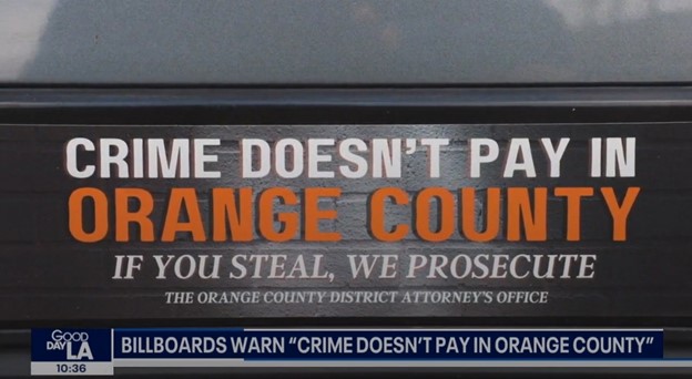 최근 오렌지카운티가 진행하고 있는 새로운 빌보드 광고 캠페인은 남부 캘리포니아 전역의 범죄자들에게 "Crime doesn’t pay in Orange County, If you steel, we prosecute!오렌지 카운티에서는 범죄로 얻을게 없다. 도적질하면 기소된다"라는 분명한 메시지를 보내는 것을 목표로 하고 있는 것도 중요한 포인트다.