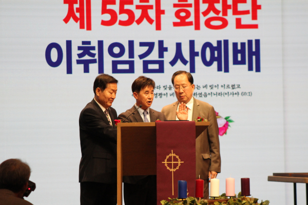 예배는 54대 수석부회장이었던 샘신 목사가 인도하고, 기도에 김은목 목사(55대 수석부회장)가, 성경봉독에 김창영 목사(55대 부회장), 말씀선포는 이임하는 최영봉목사가,  헌금기도에 권영신 장로(55대 부회장), 광고에 최영하 목사(54대 총무), 그리고 축도는 한기형 목사(31대 증경회장)가 나섰다.