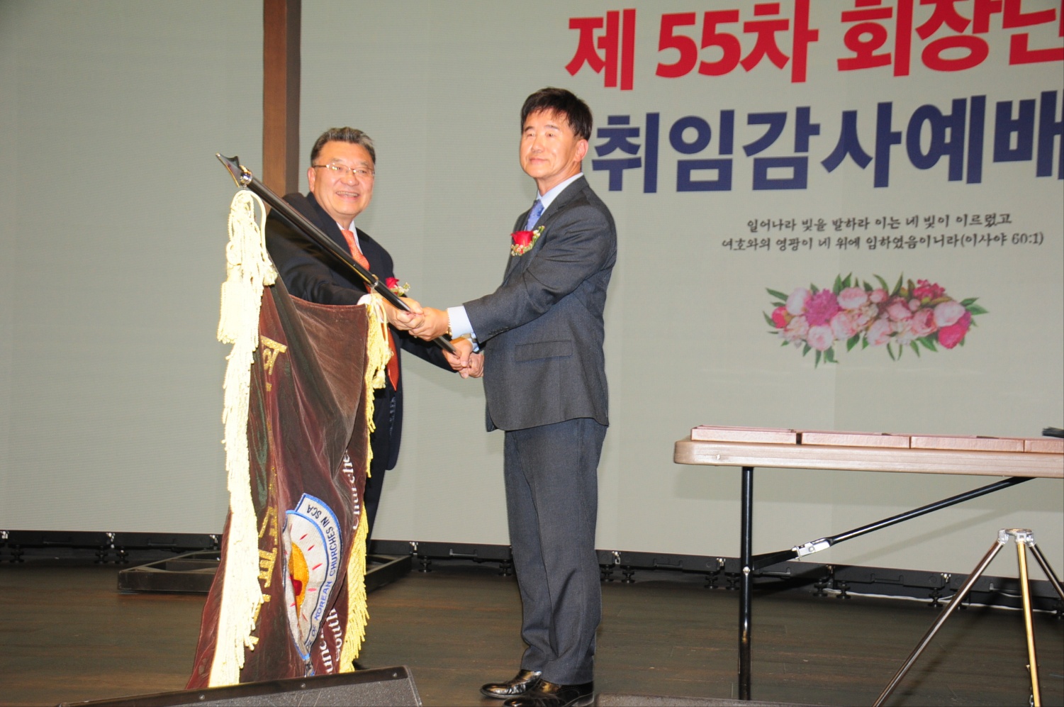 이임하는 54대 최영봉 목사가 신임 샘신 목사에게 협회기를 이양을 하고 있다.