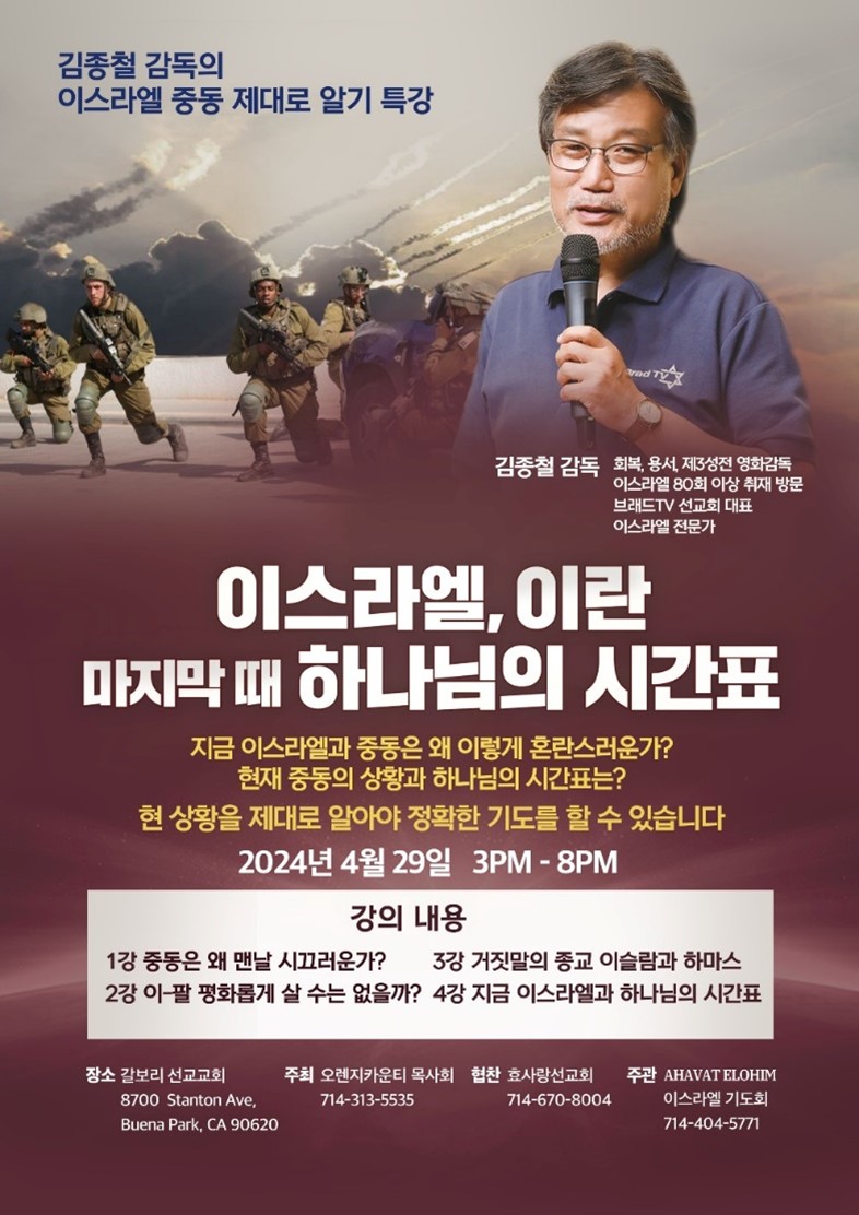 일시는 4월29일 오후 3시부터 8시까지이고 장소는 갈보리선교교회(심상은목사 시무, 8700 Stanton Ave., Buena Park), 으로 OC목사회 주최, 효사랑선교회(대표 김영찬목사)가 협찬하며, Ahavat Elohim이스라엘기도회가 주관한다.