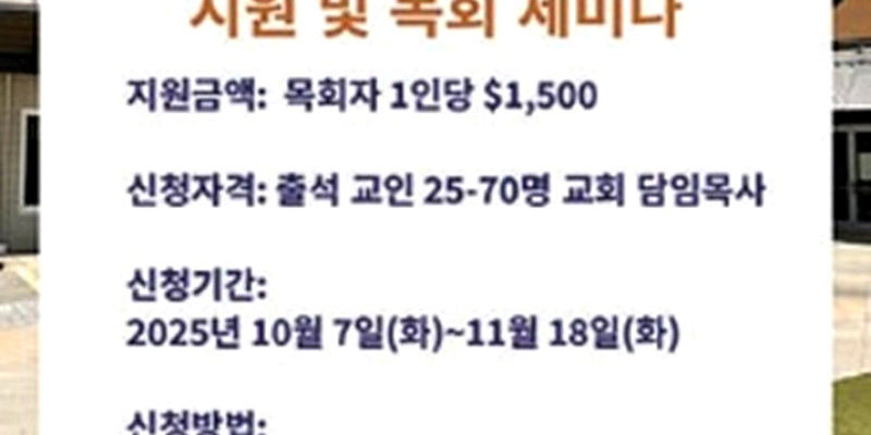 이번에 전달되는 지원금은 목회자 1인당 $1,500 불로 50명에게 해당된다. 신청자격은 현재 출석교인 25~70명의 교회 담임목사에 한하며 신청부터 세미나 참석까지의 주요 일정을 확인할 것을 부탁했다.