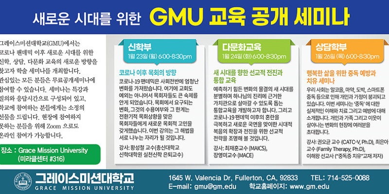 세미나에 대한 자세한 문의는 전화 714–525–0088 혹은 이메일(gmu@gm.edu), 학교홈페이지(www.gm.edu)를 통해 받을 수 있다.