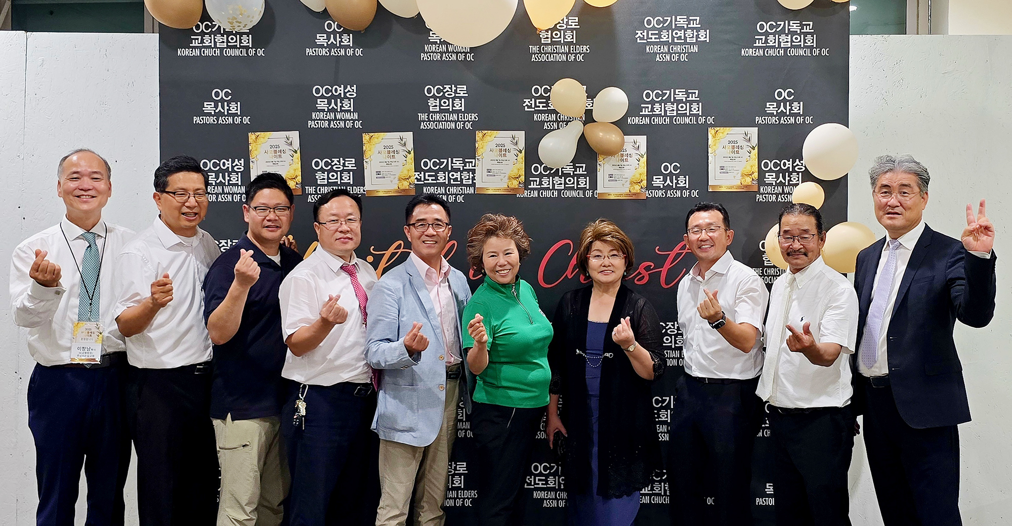 OC교계 연합으로 치루어진 사모블레싱의 준비를 도맡았던 OC교협과 전도회연합회 임원들이 기념촬영을 하고 있다. 왼쪽부터 회장 이창남목사, 신경섭목사, 장범원목사, 최국현목사, 신용집사, 민김권사, 윤우경권사, 조진용목사, 신동직집사, 그리고 증경회장인 심상은목사.