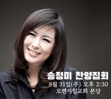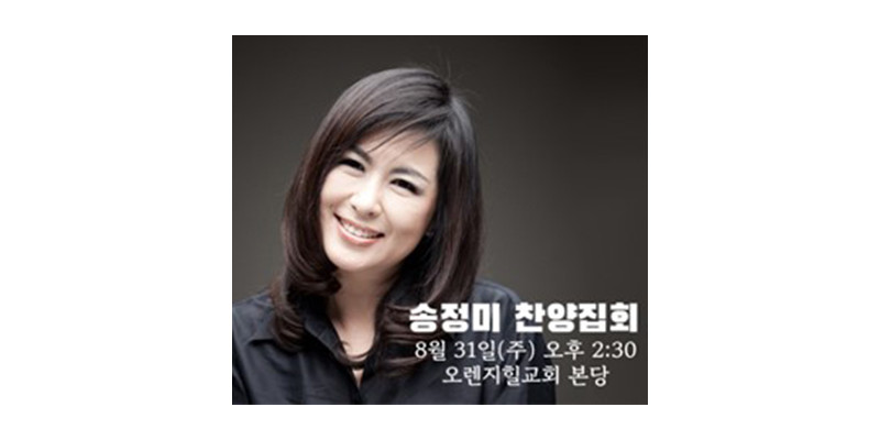 찬양사역자 송정미 사모의 미주 간증집회가 지난 8월초 미 동부 지역 워싱턴선한목자 교회 (최시영목사) 등에서 시작한 뒤 미서부 지역까지 두루 방문하면서 8월30일 코너스톤교회 (이종용목사)와  8월31일, 주일 오후, 오렌지힐 교회( 백창호목사)에서 마지막 컨서트를 끝으로 막을 내렸다.