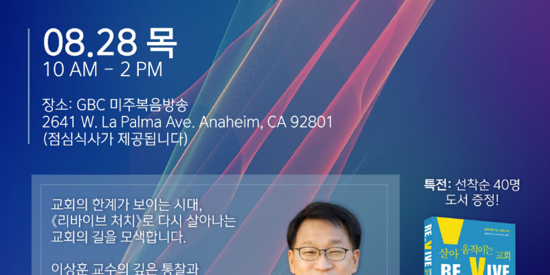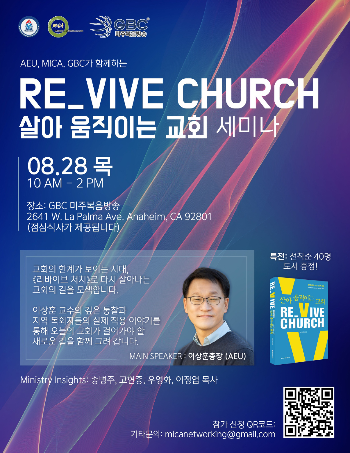 미성대학교(AEU), 미카(Missional Church Alliance, MiCA), 미주복음방송(GBC)이 공동 주최하는 ‘RE_VIVE CHURCH 살아 움직이는 교회’ 세미나가 오는 2025년 8월 28일(목) 오전 10시부터 오후 3시까지 미주복음방송 공개홀에서 열린다.