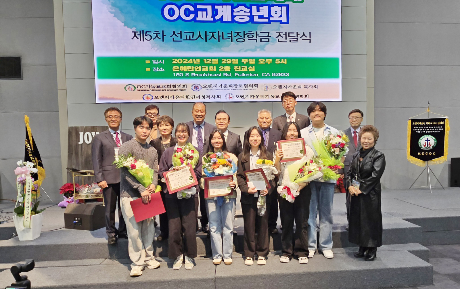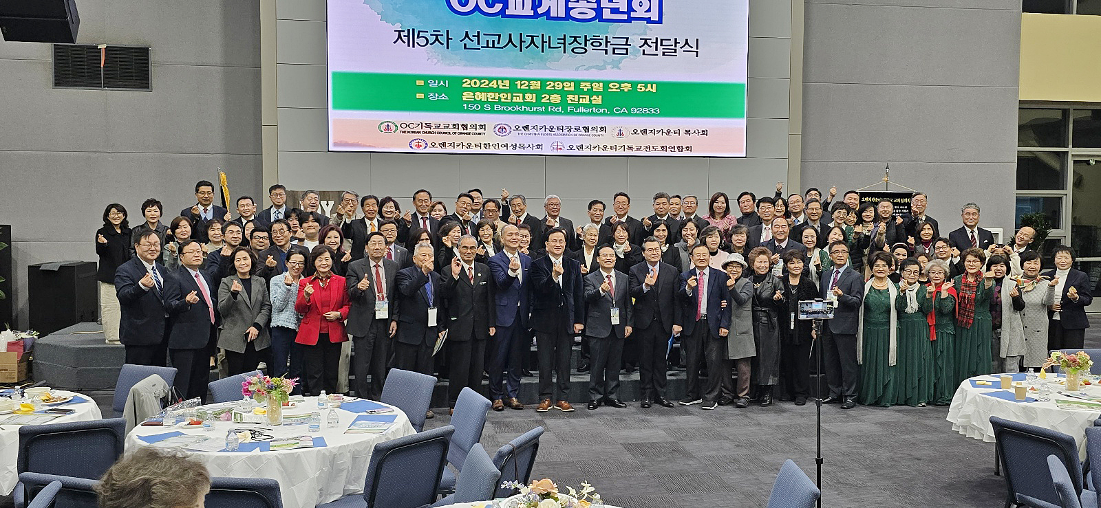 오렌지카운티 교계 연합 송년회가 올해는 제 34대 OC교협 회장단 이취임예배 및 제5차 선교사자녀장학금전달식과 함께 열렸다. 이번 행사는 지난 12월 29일 (주일) 오후 5시에 은혜한인교회 2층 친교실에서 지역 및 교계 기관과 단체장들이 대거 참여한 가운데 성황리에 진행됐다.