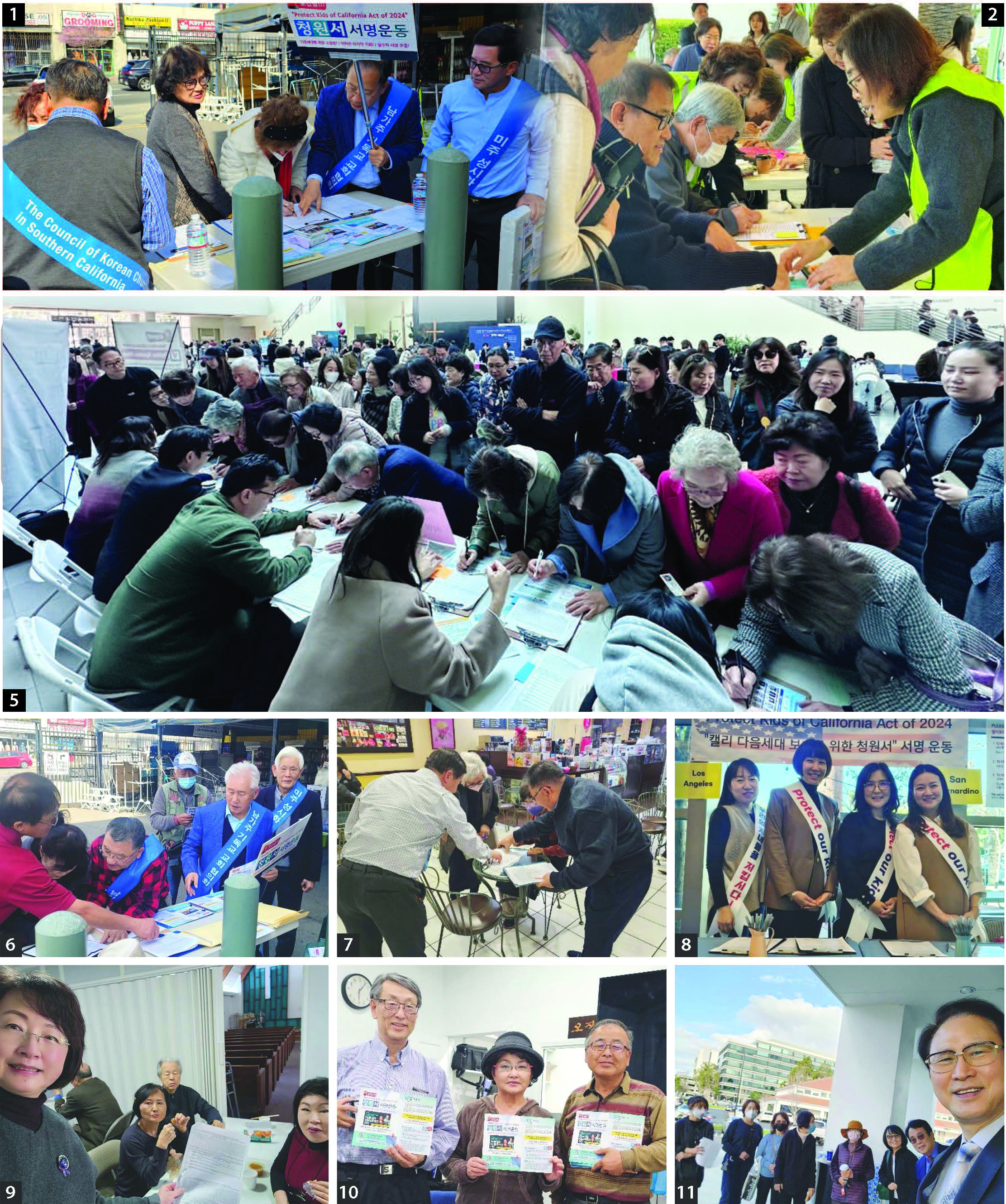 ❶❻❼ 남가주교회협의회(회장 최영봉목사, 수석부회장 샘신 목사 등)와 미주성시화 송정명 목사, 크리스천헤럴드 대표 이성우목사 등이 한인타운 김스전기 앞과 쇼핑센터들을 돌면서 주민발의안 서명운동을 펼치고 있다. ❷이번 서명 운동은 1세대 뿐 아니라 1.5세대 2세들로 부터도 적극적인 호응을 받고 있다. 남가주사랑의 교회 EM미니스트리 역시 발 벗고 나서 하루동안 885명의 서명을 확보했다. ❸“하마트면 내 딸을 잃어버릴뻔했어요”라며 지난 2월17일 단체장조찬기도회에서 자녀지키기 주민발의안 신청의 배경을 설명하고 있는 공동발의자 에린 프라이데이 변호사와 통역을 맡은 김황신목사, ❹서명운동 관련 상황설명과 비전캐스팅을 나눈 강순영목사와 유수연ABC교육위원, 진행을 맡은 박세헌목사(photo by People’n Society), ❺LA와 오렌지카운티에서 확산되고 있는 자녀지키기 서명운동(제공 은혜한인교회). 교회측은 주일예배 후 진행해서 하루동안 1,000명의 유권자 서명을 받았다고 전했다. 교회측은 마감일인 4월13일까지 1만명의 서명을 목표로 하고 있다고 밝혔다. ❽이번 서명운동은 풀뿌리 운동처럼 교회와 기관들에서 적극 협조하고 있다. 사진은 남가주사랑의교회 로비에서 서명운동을 받고 있는 교인들, ❾서명운동에 적극 나서고 있는 유수연 ABC교육위원들과 학부모들, ❿서명운동에 적극 동참을 요청하는 서명운동본부의 박세헌목사와 TVNEXT.org남가주 담당 윤우경 발행인, 양경선 목사(Photo by People\'n Society), 11. 토렌스 주님세운교회(박성규 목사)성도들과 미주성시화운동본부 관계자가 지역 마켓앞에서 서명을 받고 있다.