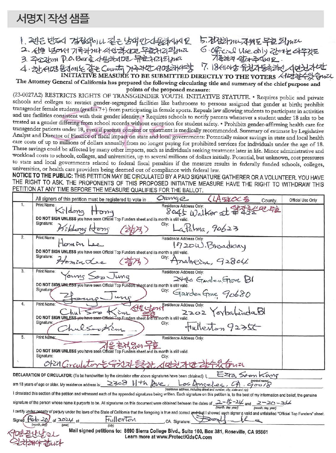 청원서를 작성할 때 주의 사항은 ▶18세 이상 유권자 등록을 마친 미국 시민권자(Registered Voter), 캘리포니아 거주자 ▶거주하는 카운티 별로 청원서에 서명해야 하며 여러 명이 한 청원서에 서명할 때는 모두 동일한 카운티 거주자로 제한해야 한다. ▶Official Use Only 칸 안에 어떤 낙서도 금지된다. ▶ 검정색, 파란색 펜만 사용 가능 ▶서명서 작성시 글씨가 기입란 선을 넘을 경우 그 페이지 전체가 무효화 된다. ▶ 기입 주소는 신분증에 등록된 주소와 동일해야 한다. ▶ P.O. Box기입은 불가하며 그 페이지 전체 서명을 무효화 시킨다. ▶시니어를 위해 대필할 경우, 그분들의 license를 받아서 그분들이 보시는 앞에서, 이름과 주소를 적어야 하며, 싸인은 본인이 직접해야 한다 ▶ 오탈자 수정을 위해 액상(white out)이나, 수정 테이프(correction tape) 사용 역시 그 페이지를 모두 무효화 시킨다. (Sample 참조)