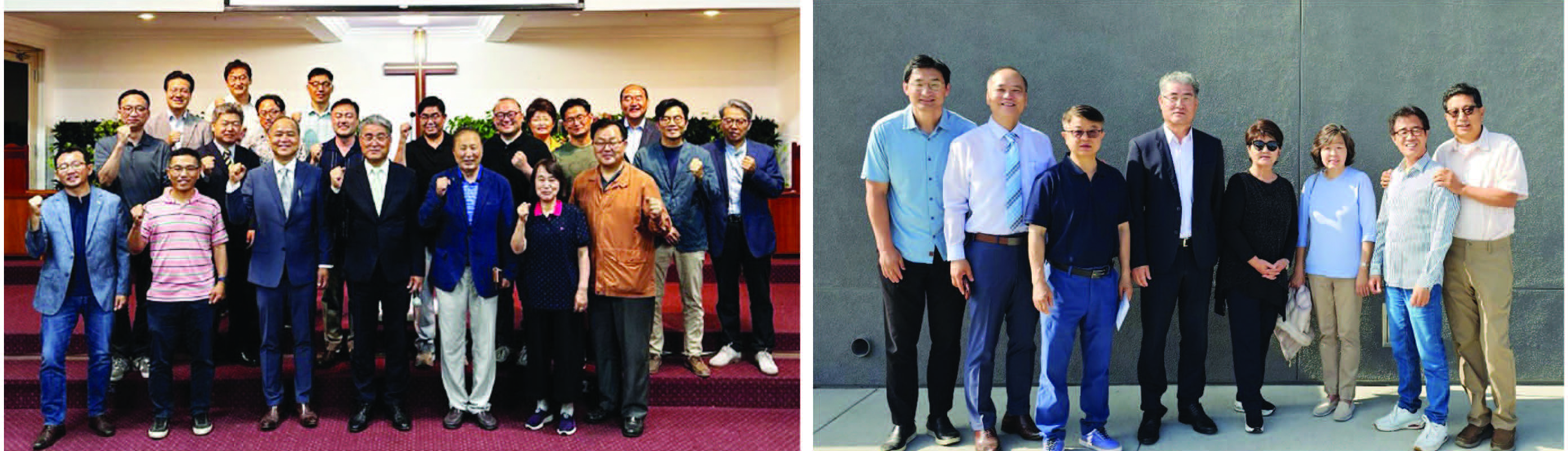 제 3차 21인 차세대목회자 초청 OC영적대각성 새벽기도회 준비 첫모임을 마치고 강사진 및 관계자들이 단체사진을 찍고있다(사진 왼쪽). 새벽기도회 준비모임을 마치고 준비위원들이 기념촬영을 했다. 왼쪽부터 서기 정우영목사, 수석부회장 이창남목사, 분과위원 제임스한목사, 심상은목사, 윤우경권사, 후원이 사 김수연대표, 신용회장, 신경섭 분과위원 등. 1.5세대인 총무 조진용목사(바인교회)는 여름방학을 맞아 캄보디아와 한국선교중으로 불참했다.