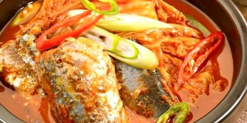 김치가 7-8 동안 끓여진 후 김치 위에 쌀뜨물 3 컵을 부어주고 그위에 손질된 , 칼집을 낸 고등어  토막들을 올리고 그위에 양념된 야채양념물을 부어 준 후 냄비 뚜껑을 닫고 약불에 20 정도 찜해주시면 완성이요!