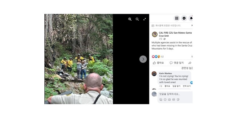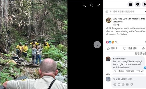 23일 캘리포니아주 소방국에 따르면 이 소방국 소속 구조대는 지난 20일 저녁 샌프란시스코 남쪽에 있는 빅베이슨 레드우즈 주립공원의 깊은 산 속에서 실종 신고된 남성 루카스 매클리시(34)를 찾아내 구조했다.
