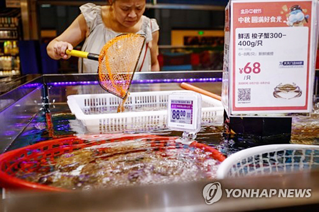 중국, 日오염수 방류에 수산물 수입 전면 금지. 일본이 후쿠시마 제1원자력발전소 오염수(일본 정부 명칭 \'처리수\')의 해양 방류를 시작한 24일 중국 베이징의 대형마트에서 한 여성이 수산물을 보고 있다. 중국 해관총서(세관)는 이날 일본의 오염수 방류 개시 직후 발표한 성명에서 일본이 원산지인 수산물 수입을 전면 중단한다고 밝혔다.