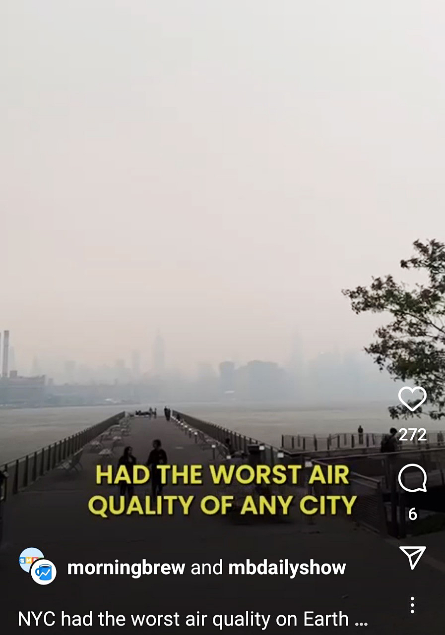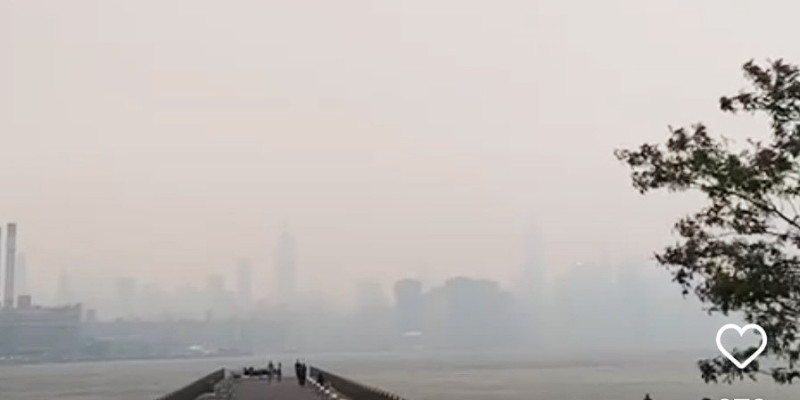 지속되는 캐나다 지역 산불이 진정의 기미가 보이지 않는 가운데 평소 대기오염 문제가 거의 없는 뉴욕에서 신종 코로나바이러스 감염증(코로나19) 대유행이 사그라든 이후 마스크 착용자가 증가할 만큼 대기 오염도가 나빠지고 있다. (뉴욕 인스타 그램 캡쳐)