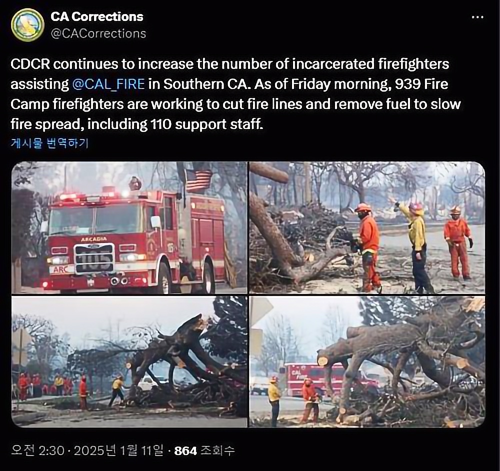 캘리포니아 교정갱생부 공식 발표에 따르면 지원인력 110명을 포함해 죄수 939명이 이번 산불 진압에 투입돼 소방당국을 보조하고 있다.