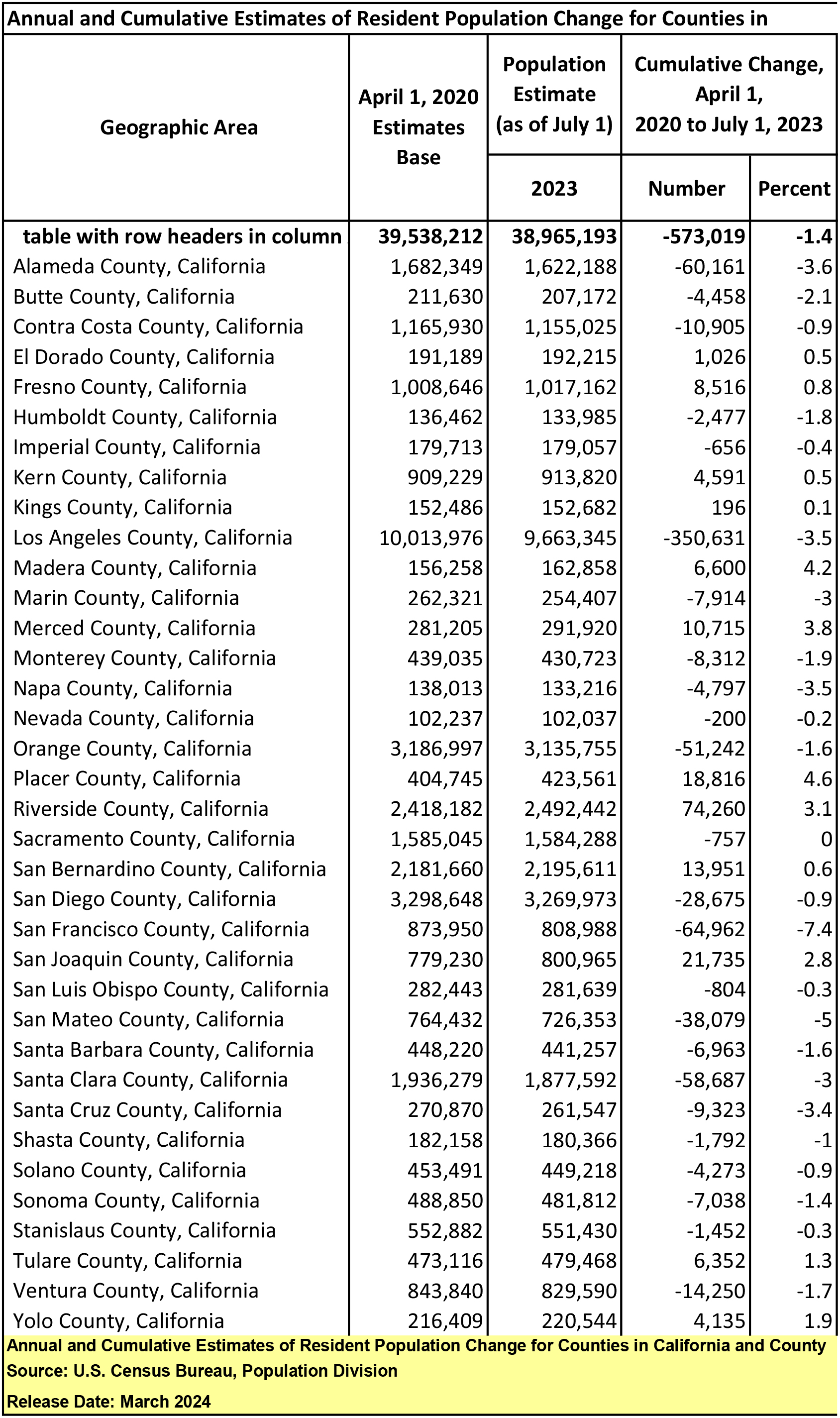 알라메다, 아마도르, 글렌, 로스앤젤레스, 마린, 나파 플루마스, 산타클라라, 산타크루즈, 트리니티 카운티 모두 인구가 3% 감소했으며, 대부분이 해안에 위치해 있다.