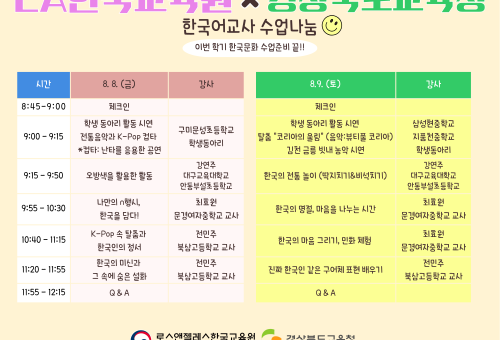 LA한국교육원(원장 강전훈)과 경상북도교육청(교육감 임종식)은 오는 8 월 8일(금)과 9일(토)에 정규 초중고교 한국어반 교사와 한글학교 교사 들을 대상으로 ‘실전에 바로 적용 가능한 한국문화 수업나눔 연수’ 를 LA한국교육원에서 개최한다. LA한국교육원과 경상북도교육청은 2024년부터 한국어교육 기반 국제교 류 활성화 사업을 함께 추진해왔으며, 이번 연수는 경상북도교육청에서 선발한 우수교사들이 최신 한국문화 수업 방법과 교육자료를 나누는 등 미국의 학교에서 한국어ㆍ한국문화 수업 준비를 실질적으로 지원하 기 위해 기획되었다고 밝혔다. 주제는 ‘실전에 바로 쓰는 한국문화 수업’으로, 교사들이 연수 후 즉 시 수업에 활용할 수 있는 PPT, 활동자료, 만들기 도안 등 풍부한 자료 패키지를 제공하며, 참가자들이 한 번의 연수를 통해 이번 학기 한국문 화 수업 준비를 마칠 수 있도록 돕는 것이 핵심 목표다. 수업나눔은 총 3명의 경상북도 소속 우수 교사들이 주도하며, 수업의 내용과 방식 또한 다양하게 구성되어 있다. 강연주 교사 (대구교육대학교안동부설초등학교)는 ‘오방색’을 활용한 체험 활동과 한국 전통놀이를, 최효원 교사 (문경여자중학교)는 ‘나만의 n행시’, 한국 명절 문화, 민화 체험을, 그리고 전민주 교사는(북삼고등학교)K-Pop 속 탈춤과 한국인의 정서, 한국 전설, 진짜 한국인 같은 구어체 표현 배우기를 담당한다. 또한 경북의 초등학교ㆍ중학교 동아리 학생들이 참여하여, 탈춤, 컵타 (컵을 이용한 난타 공연) 등 한국문화 동아리 활동을 직접 시연하며 미 국 내 교사들에게 교육적 영감을 제공할 예정이다.연수 참가를 희망하는 교사들은 하루 또는 양일 모두 참석이 가능하며 온라인 사전 등록은 필수다.등록은 8월 3일까지 온라인으로 신청할 수 있으며, 선착순 40명까지 접 수를 받습니다. 상세한 내용은 연수 포스터와 LA한국교육원 홈페이지 (www.kecla.org) 게시판을 통해 확인할 수 있다.강전훈 LA한국교육원장은 “이번 연수는 미국 현지에서 한국문화와 언 어를 가르치는 교사들에게 현장 중심의 실용적인 교육 자원과 수업 아 이디어를 제공함은 물론, 한-미 교육자 간의 협업 가능성을 모색하는 중요한 기회가 될 것”이라고 말하고,“서로 다른 교육 환경 속에서 활 동하는 한-미 교사들이 함께 배우고 성장하는 자리가 되기를 바란다” 고 전했다.