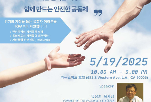 KFAM(한인가정상담소·소장 캐서린 염)은 오는 5 월 19 일(월), LA 가든스위트 호텔에서 제 6 회 가정폭력예방 목회자 컨퍼런스를 개최한다.  이번 컨퍼런스는 “가정을 살리는 목회, 교회를 살리는 가정 – 함께 만드는 안전한 공동체”를 주제로, 한인 커뮤니티 안에서 가정폭력 문제를 신앙 공동체가 어떻게 이해하고 대응할 수 있는지 함께 고민하고 배우는 자리다. 목회자뿐만 아니라 신학생, 전도사, 목회자 사모 등 사역에 관심 있는 누구나 참여 가능하다. 행사는 오전 10 시부터 오후 3 시까지 진행되며, 등록비는 무료, 사전 등록자에게는 점심식사가 제공된다. 메인 강연자로는 “유상훈 목사(The Faithful City 설립자, AZTIFC)가 초청되어, 사회복지학 석사(MSW) 및 목회학 박사(D.Min) 학위를 바탕으로 가정폭력의 실제 사례와 교회 내 대처 방안, 그리고 피해자 지원을 위한 유용한 리소스를 공유할 예정이다. KFAM 의 소장 캐서린 염은 “신앙 공동체 안에서 조용히 아픔을 감내하는 이들이 있다. 그 분들에게 먼저 다가가 손을 내밀 수 있는 분들이 사역자들이며, 이번 컨퍼런스가 그런 따뜻한 연결의 시작점이 되길 바란다”라고 전했다.  등록 마감은 5 월 5 일(일)까지이며, 아래 링크를 통해 신청할 수 있다.  등록링크: https://forms.gle/dd4GwDA48ZooTbAE6 문의: 강유미 213-600-7310 / ykang@kfamla.org